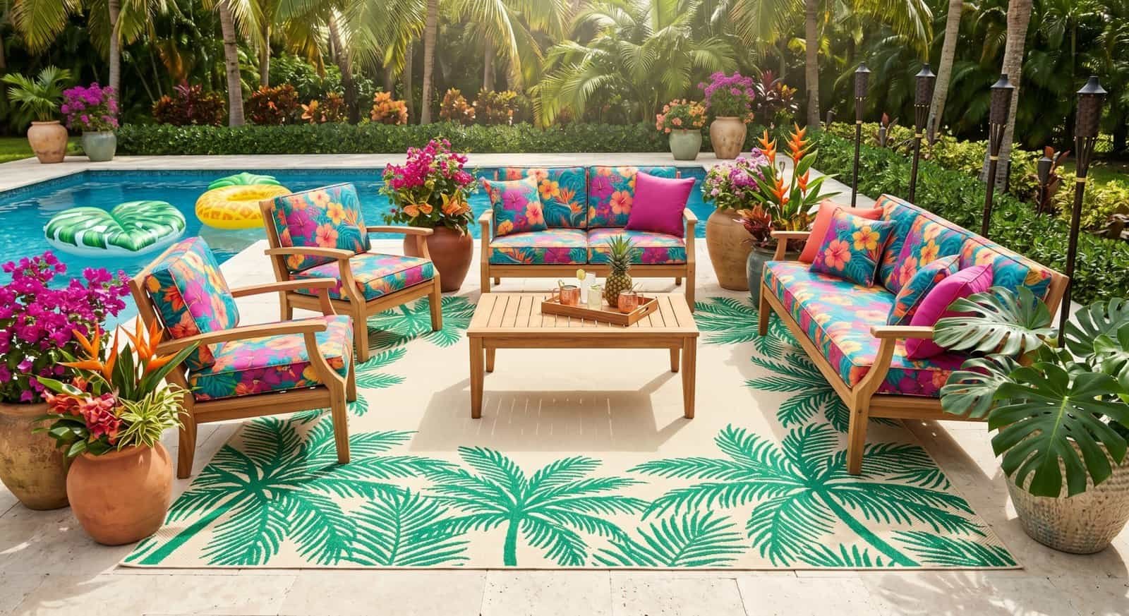 For anyone embracing the tropical outdoor aesthetic — bright colors, lush greenery, vacation vibes — the Gertmenian palm tree border rug is the signature piece that anchors the entire look. The bold palm tree border pattern in green and cream reads as genuinely tropical rather than kitschy, and the quality of construction supports the style.The 100% polypropylene construction with a tight flatweave handles pool splashes, sunscreen spills, and heavy humidity without showing wear. The reversible design means you can flip it seasonally to extend its life, effectively doubling your investment.