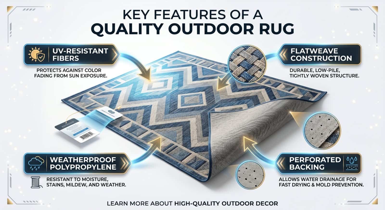 Drainage features prevent disaster. Look for perforated backings, breathable weaves, or raised textures that allow water to flow through rather than pool underneath. A rug that traps water on your deck causes mold, wood rot, and staining that is nearly impossible to remove. The best 2026 outdoor rugs all include drainage features in their design.