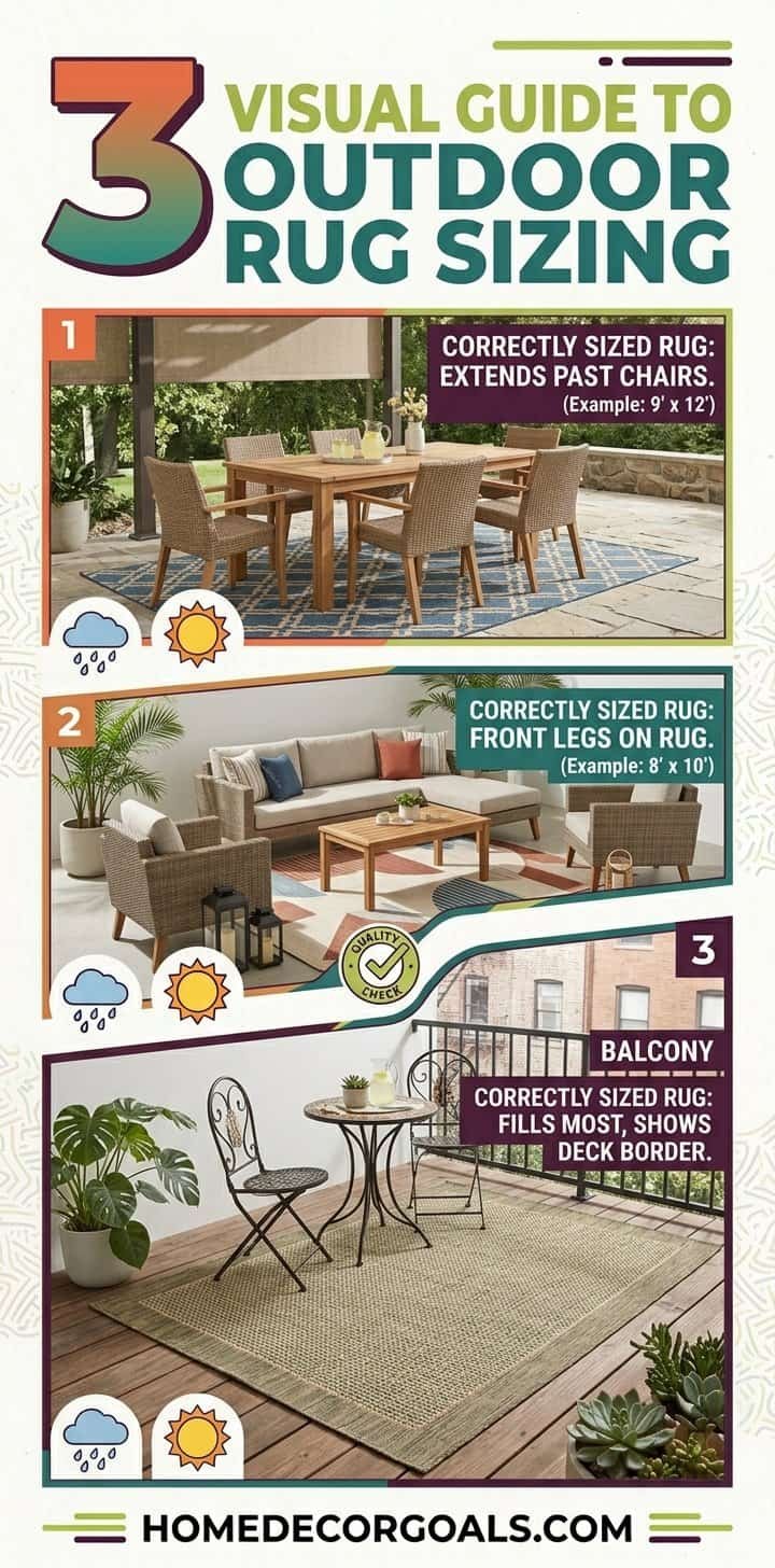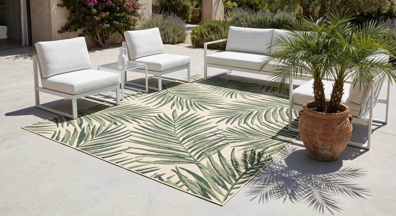 For dining areas: rug extends at least 24 inches beyond the table edge. For seating areas: front legs of all furniture sit on the rug. For balconies: 4×6 or 5×7 works for most. For large patios: 8×10 or 9×12 anchors the space properly. Always measure your actual usable space before ordering — outdoor rugs look larger in photos than in reality.