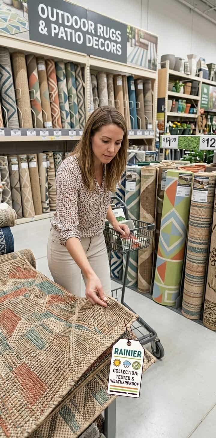 For anyone who wants to see and touch an outdoor rug before buying it, the Allen + Roth collection at Lowe’s represents the best quality you can find at a brick-and-mortar home improvement store. The benefit of buying in person is obvious — you can verify the colors match what you saw online, feel the texture and thickness, and take it home immediately without waiting for shipping.The collection rotates seasonally, but standard offerings include classic geometric patterns, solid colors, and tropical prints in the $80 to $199 range. Construction quality is consistent mid-range — not premium, but not budget — and the store’s return policy means you can bring it back easily if it does not work in your space.