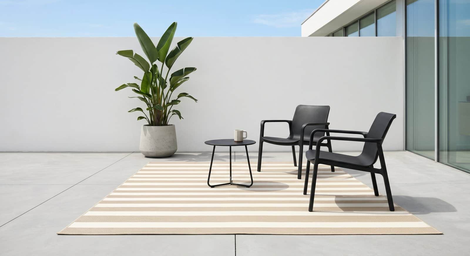 Material matters more than anything else. Polypropylene — also called olefin — is the gold standard for outdoor rugs because it genuinely handles weather without breaking down. It resists fading from UV rays, does not absorb water, and can be hosed off when dirty. Recycled PET (plastic bottle fiber) is the eco-friendly alternative that performs nearly as well. Avoid cotton, wool, jute, and sisal for true outdoor use — they look beautiful in photos taken on dry sunny days, but they rot, mold, and stain the moment real weather happens. The only exception is a covered porch that never gets rain or direct sun.