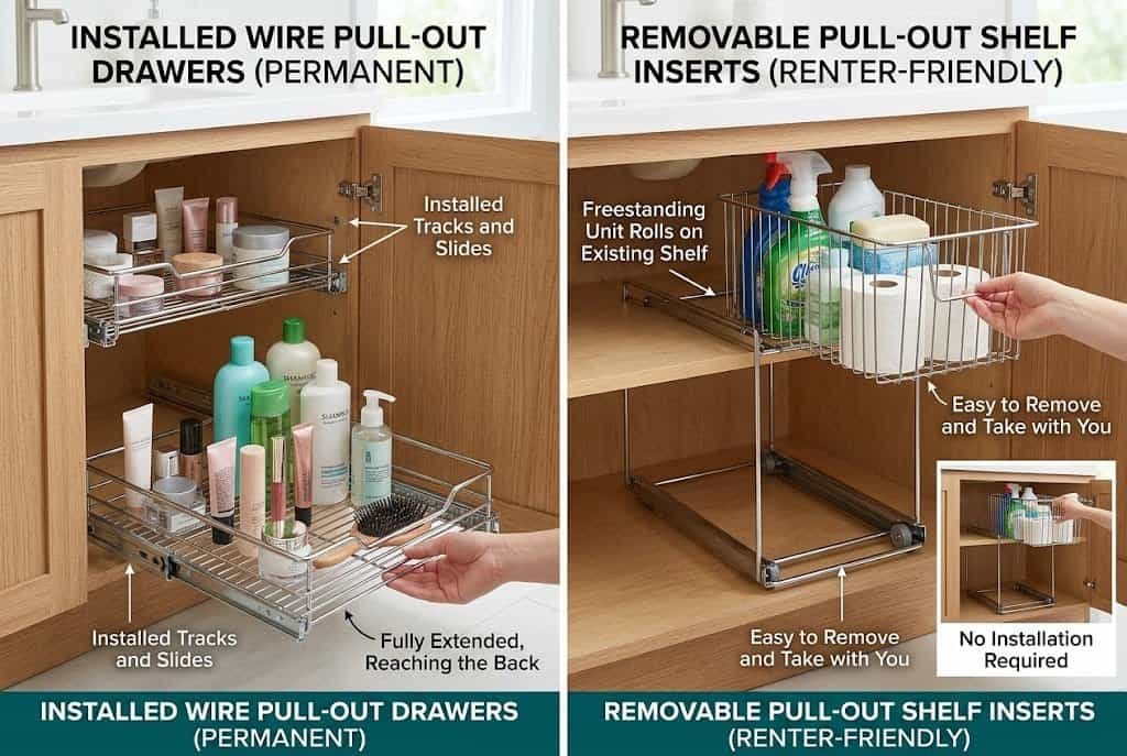 For renters or anyone who doesn’t want to install tracks, pull-out shelf inserts (essentially baskets on rolling tracks) provide similar benefits without permanent modification. These can be removed when you move out and used in your next bathroom. The improvement in accessibility is identical to installed pull-outs, though the look is slightly less seamless.