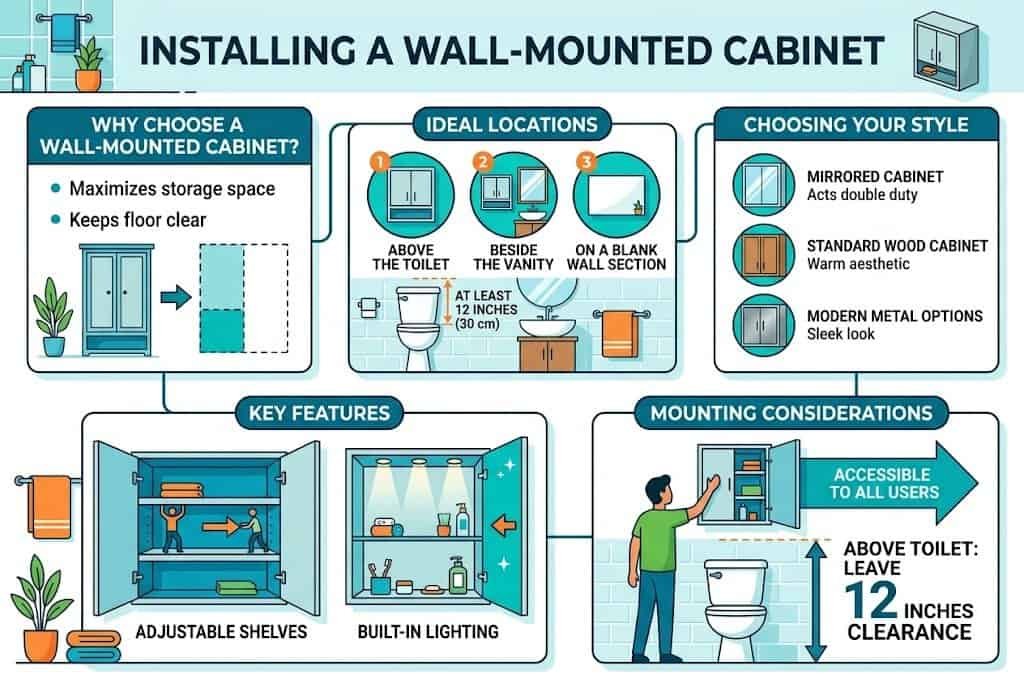 A wall-mounted cabinet (essentially a small enclosed cabinet hung on the wall, similar to a kitchen wall cabinet) provides significant storage without taking floor space. These cabinets work especially well above the toilet, beside the vanity, or on any blank wall section.