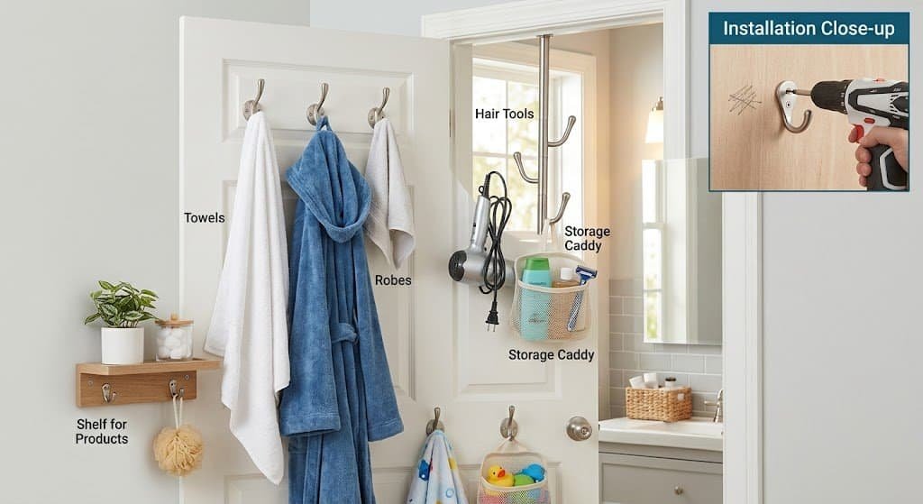 The back of the bathroom door is another universally underutilized storage zone. Adding hooks transforms this space into prime storage for towels, robes, hair tools, and even storage caddies. Multiple hooks at varying heights serve different family members and different purposes.