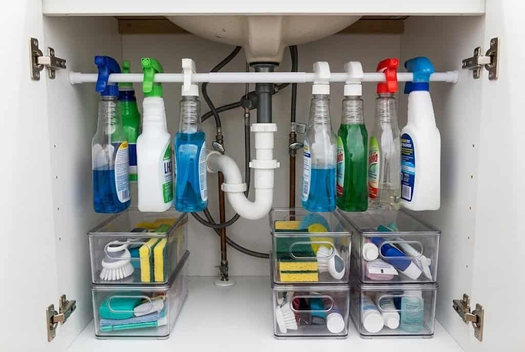 This is one of those storage hacks that costs almost nothing — a single tension rod from the dollar store — but transforms an unusable space into functional storage. Combined with stackable bins on the cabinet floor for items that don’t hang well, this approach maximizes every inch of awkward under-sink space.