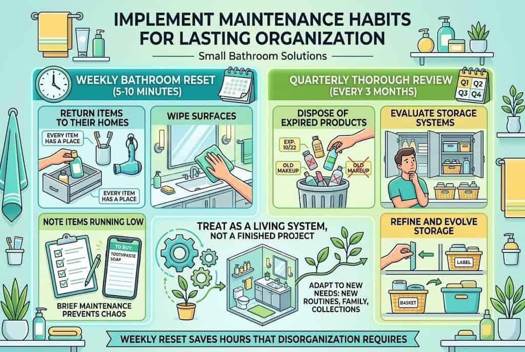 Build a weekly bathroom reset into your routine — five minutes of returning items to their homes, wiping down surfaces, and noting items running low. This brief maintenance prevents the slow drift toward chaos that affects every organized space without intervention. The five minutes weekly saves the hours that disorganization would eventually require.