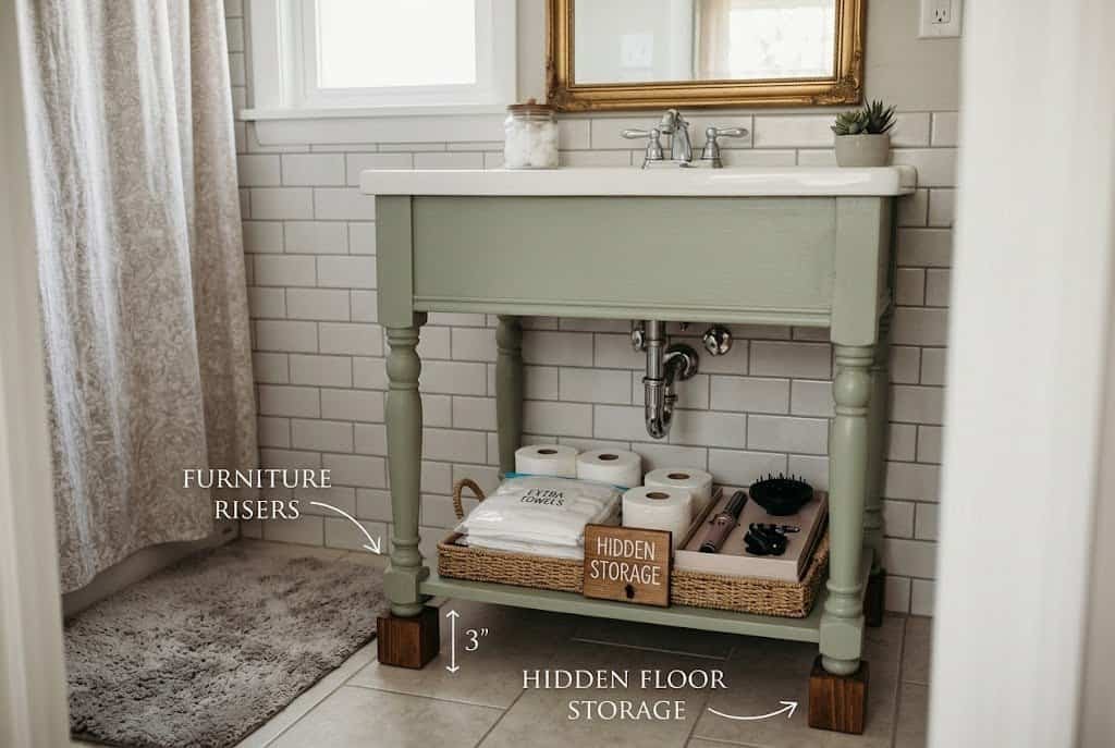 This solution works particularly well in bathrooms with vintage furniture, antique vanities, or anything with traditional furniture-style legs that already create some floor clearance. Even adding two or three inches of additional clearance with risers can create meaningful storage capacity in small spaces.