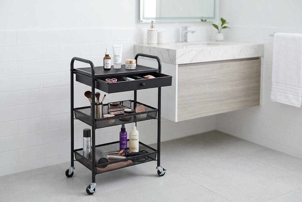 Use the cart for items you reach for during specific routines — makeup application, hair styling, skincare regimens. Roll the cart out when you start the routine, then push it back to its home position when finished. This kind of “pulled out only when needed” storage prevents counter clutter while keeping items accessible.