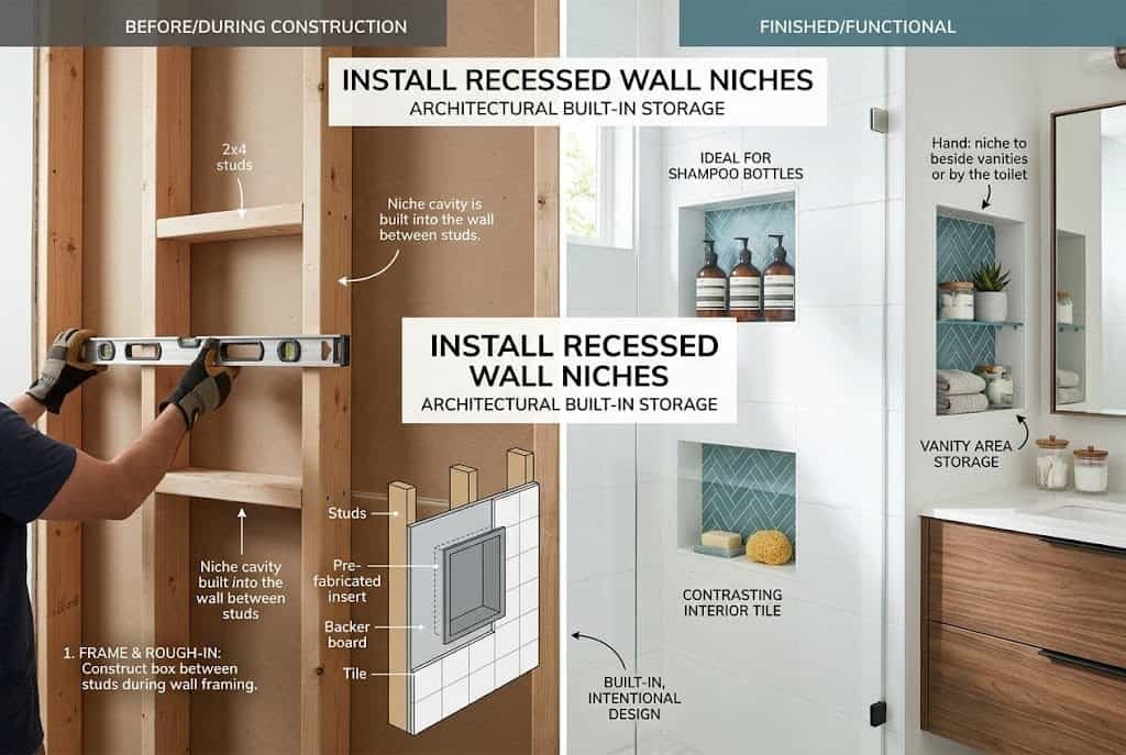 In showers, recessed niches replace bulky shower caddies and create a permanent home for bottles. Build them at appropriate heights for tall and short users. Outside the shower, recessed niches in vanity-area walls or beside the toilet can hold small decorative items, extra toilet paper, or beauty products you reach for daily. Tile or paint the niche interior in a contrasting color or material for visual interest.