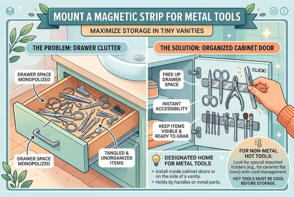 Install the magnetic strip somewhere accessible but not visually prominent — inside a cabinet door, on the side of a vanity, or in a less-trafficked wall area. The strip holds metal tools by their handles or by their metal components, keeping them visible and ready to grab. This single addition can free up significant drawer space in tiny vanities where every inch matters.