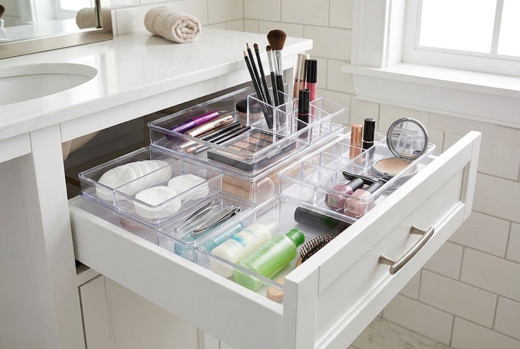 Look for stackable acrylic or plastic organizers in various sizes that allow you to customize a layout for your specific drawer dimensions. Stack two layers of organizers for items used at different frequencies — daily items on top, occasional items below. The clear material lets you see contents at a glance, which prevents the “I know it’s in here somewhere” syndrome.