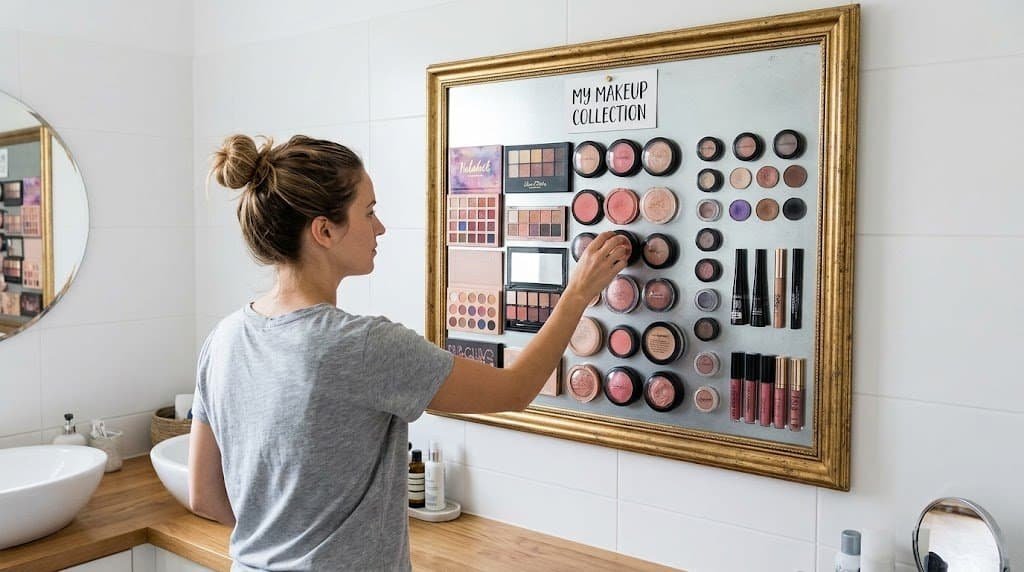 Either purchase pre-made magnetic makeup boards or DIY one using a metal board mounted to the wall and small magnetic backings attached to makeup containers. Frame the board for a polished, intentional look. Position it at vanity height where you actually apply makeup for the most useful access.