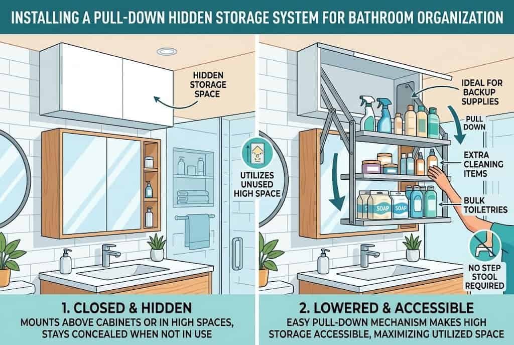 Pull-down storage systems mount above the medicine cabinet or in upper cabinets and pull down for access while remaining hidden when closed. These systems make use of high spaces that are otherwise difficult to access, particularly valuable in small bathrooms where every inch counts.