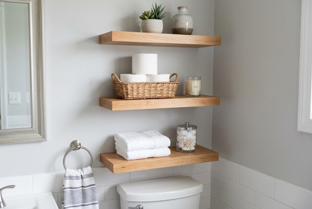 The wall space above the toilet is the most universally underutilized real estate in any small bathroom. Standard floating shelves installed in this space create instant storage without requiring any floor footprint, which is exactly what cramped bathrooms need. This single addition typically adds significant capacity that transforms how the bathroom functions.