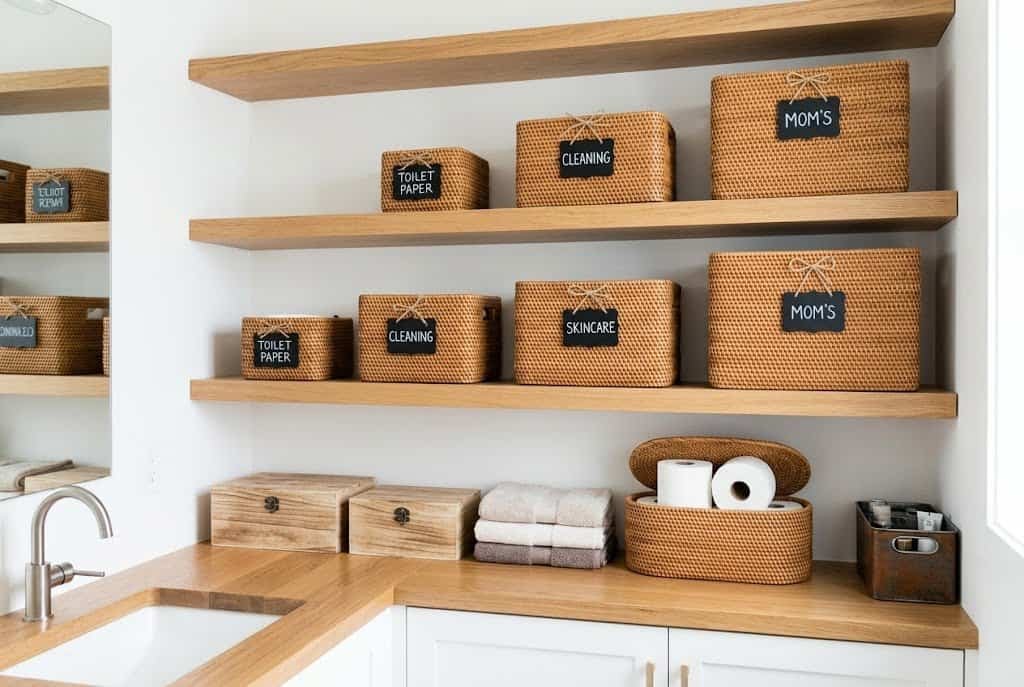 Label baskets if multiple family members use the bathroom and need to know which container holds what. Even simple chalkboard labels keep contents identifiable while maintaining the styled aesthetic. The combination of beautiful containers plus practical labeling delivers everything bathroom storage needs to be — functional, attractive, and intuitive.