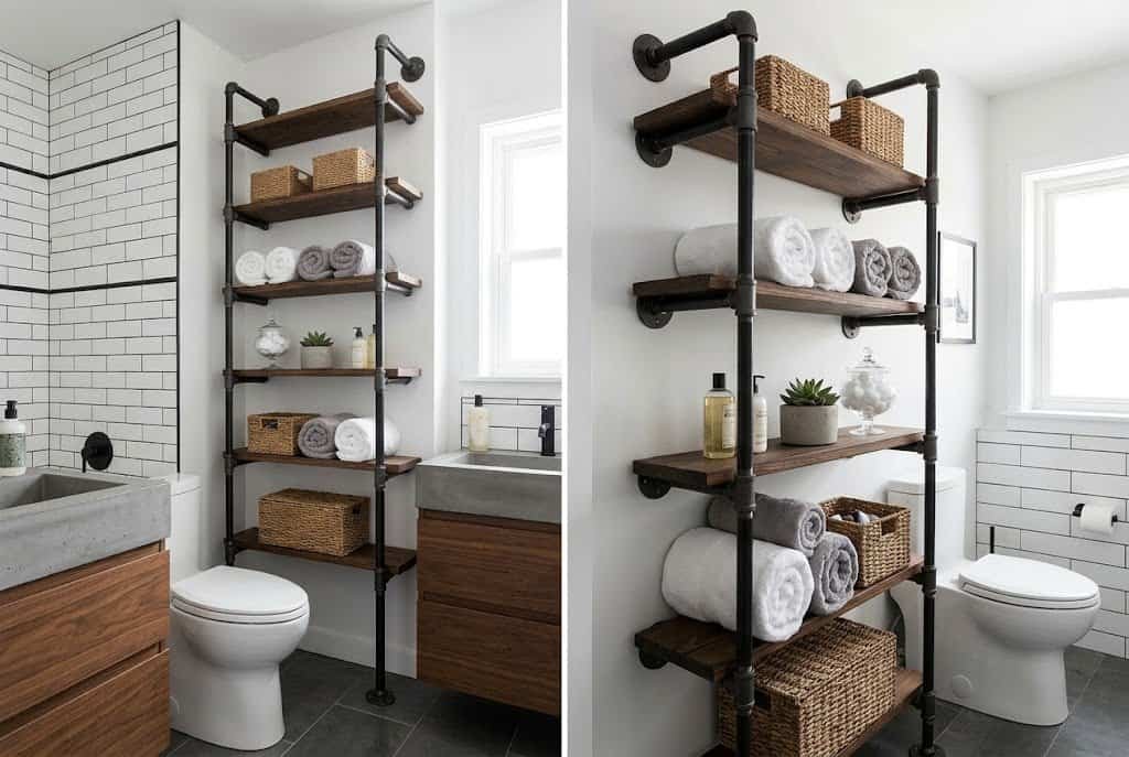 Industrial-style pipe shelving creates striking vertical storage that maximizes height and provides robust support for towels, baskets, and other bathroom essentials. The exposed pipes feel intentional and design-forward while delivering serious storage capacity in narrow spaces.