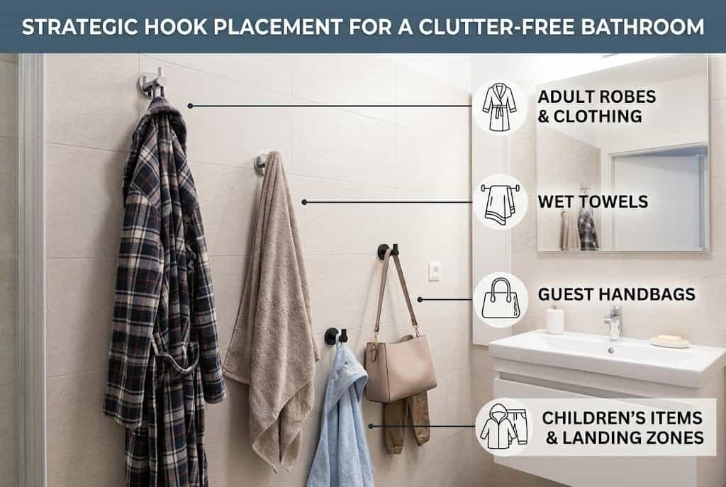 Install hooks at heights appropriate for the people using the bathroom. Adult-height hooks work for robes and clothing. Lower hooks accommodate children’s items. Position hooks where they’re useful but not visually overwhelming — typically a few hooks rather than a wall full of them.