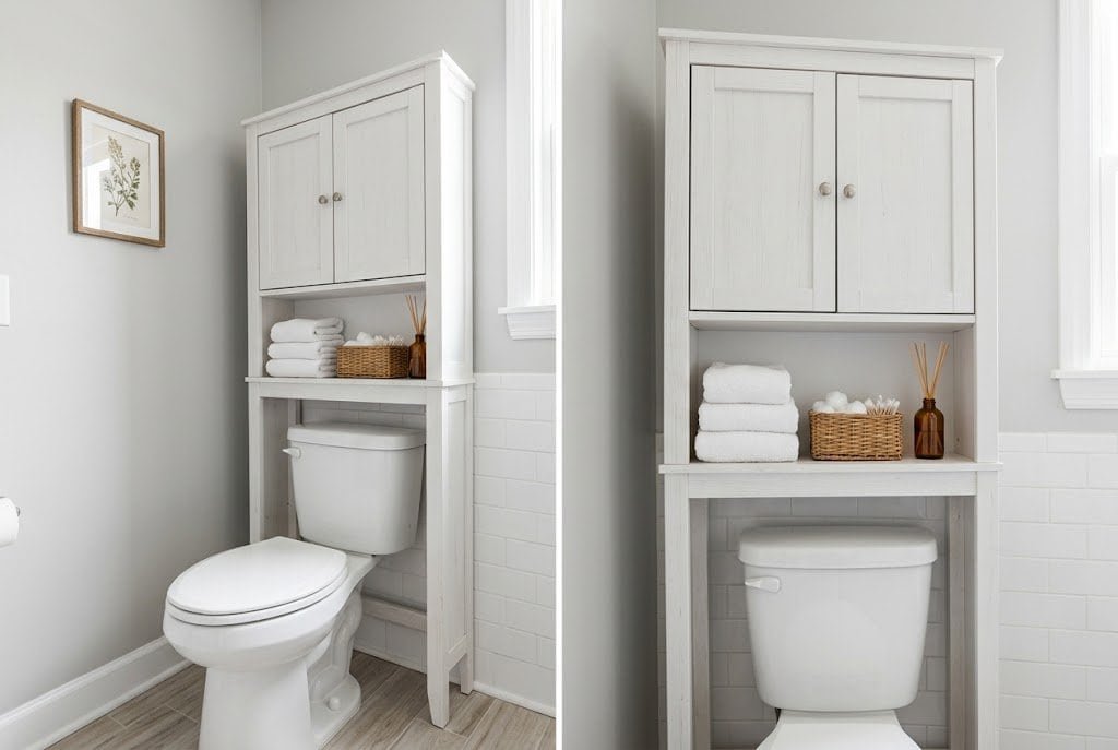 Modern over-the-toilet cabinets come in many styles ranging from rustic wood to sleek metal to traditional white-painted options. Choose one that matches your bathroom’s existing style and provides the storage configuration you actually need — open shelves for items you reach for daily, closed cabinets for things you’d rather hide. The combination of both formats in one unit gives maximum flexibility.