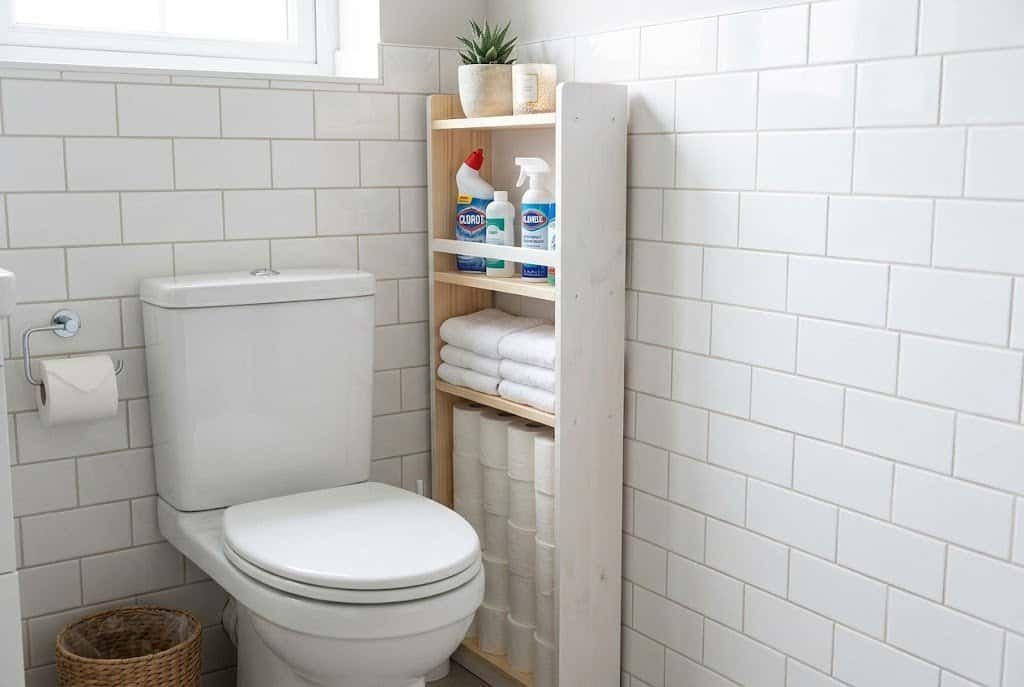 The narrow strip of space between the toilet and the wall is another underutilized zone in most small bathrooms. With the right tall, narrow storage solution, this 6-12 inches of space can hold significant supplies — typically toilet paper, extra towels, or cleaning supplies that need to live in the bathroom but don’t need prime real estate.