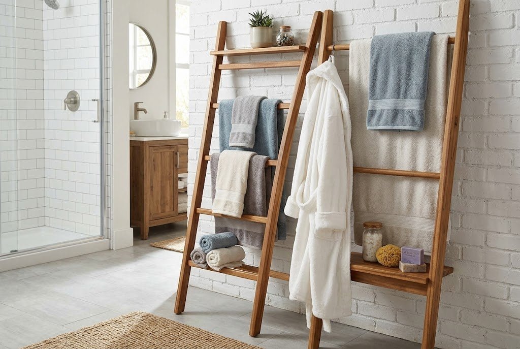 Choose ladders in materials that match your bathroom aesthetic: bamboo or rattan for natural style, painted wood for farmhouse, metal for industrial, sleek wood for modern. Position the ladder against a wall in a corner where it doesn’t block traffic flow. The ladder works best for towels you actually use because constantly damp towels need air circulation that the leaning design provides.