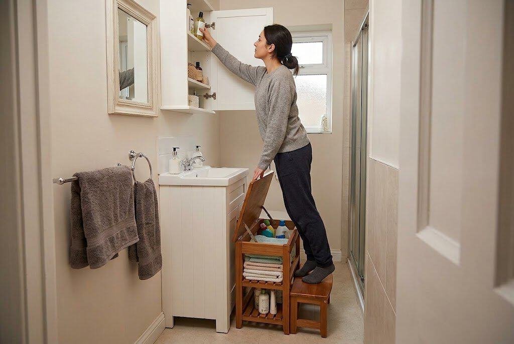 Look for step stools with hidden interior storage compartments or with shelves on the sides. Use them to store items you don’t access daily but want available — extra towels, cleaning supplies, backup toiletries. The stool position can typically tuck into a corner or under a counter when not in use.