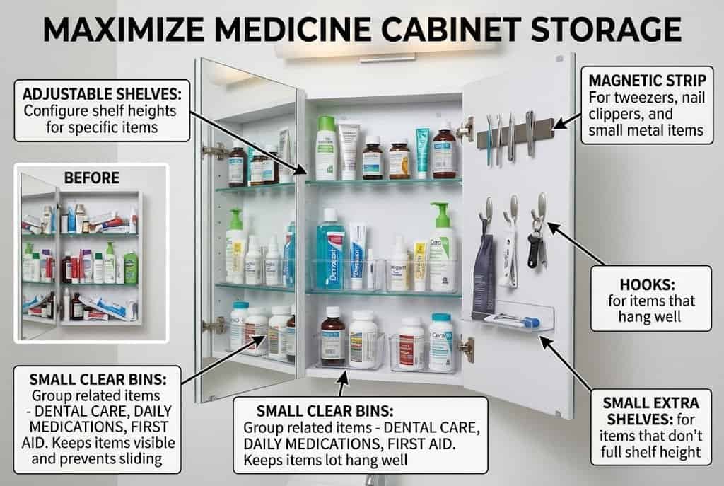 Add adjustable shelves if your cabinet supports them, configuring shelf heights for your specific items. Use small clear bins or organizers within the cabinet to group related items — dental care in one bin, daily medications in another, first aid in a third. The clear bins keep items visible while preventing them from sliding around or knocking over.
