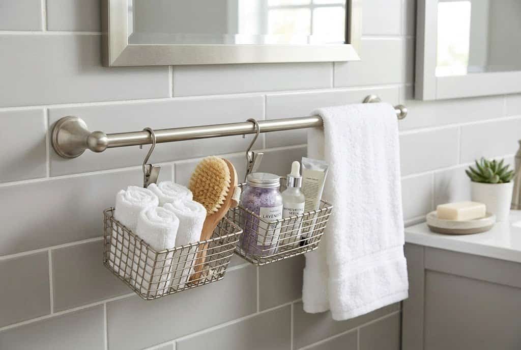 If you have wall space for a towel bar but want it to do more than just hold towels, add hanging baskets that clip onto the bar. These small baskets store extra essentials at the towel bar level, keeping items accessible without requiring separate shelving installation.