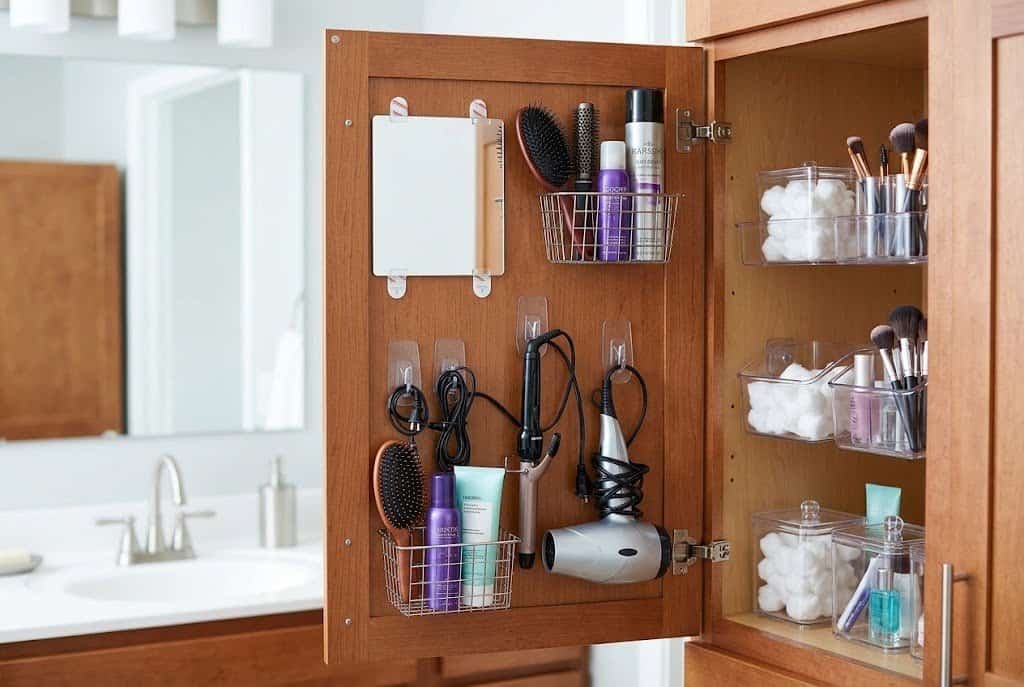 Mount small wire baskets to vanity cabinet doors for hairbrushes, hair products, or similar items used daily. Add hooks for hair tools’ cords or for the tools themselves. Install small mirrors on the inside of medicine cabinet doors for additional reflection during makeup application. Even simple adhesive hooks on cabinet door interiors can hold small items that otherwise have no good home.