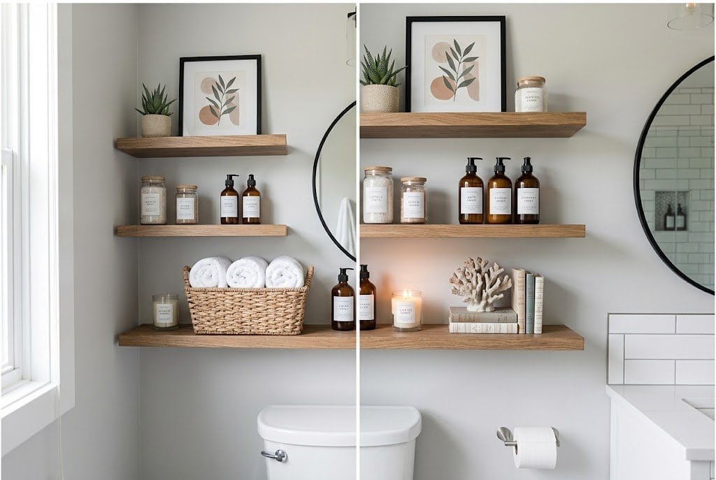 Floating shelves on bathroom walls can serve dual purposes — providing storage for items you actually need while also displaying decorative pieces that make the bathroom feel styled rather than purely utilitarian. This combination is essential in small bathrooms where every element should serve multiple functions.