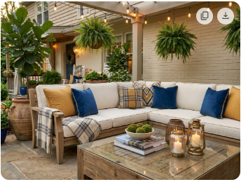 Pro Tip: Pull the sofa arrangement slightly away from the house wall instead of pushing everything against it. This creates a more intentional, room-like feel and allows air circulation behind the furniture.