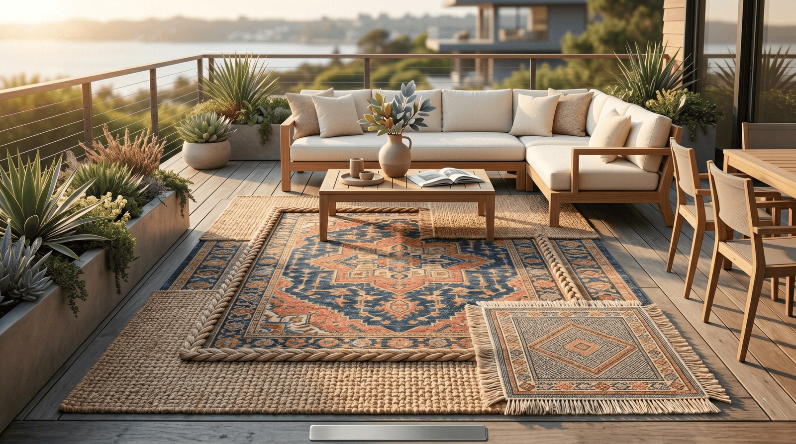 First, it defines your space. A patio without a rug is just a surface. A patio with a rug has a living room, or a dining room, or a lounge area — because the rug draws a visual boundary that your brain interprets as a room. This is the same principle interior designers use in open-plan homes to separate the living area from the dining area. It works outdoors too.