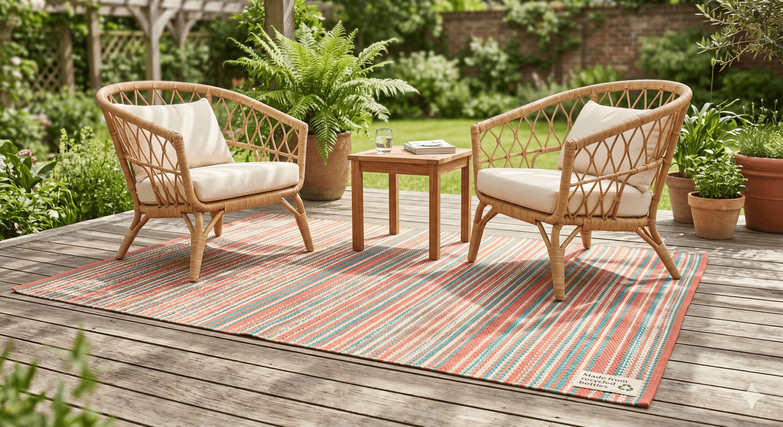These eco-friendly rugs are made from recycled plastic bottles that are melted down and spun into fiber. They have a surprisingly soft, cotton-like feel that does not betray their plastic origin.Recycled PET rugs are fully waterproof, easy to clean, fade-resistant, and lightweight enough to pick up and shake out. They dry extremely fast after rain — usually within an hour. And they feel better underfoot than polypropylene, with a woven texture closer to cotton or jute.The major advantage is the environmental angle. Each rug keeps dozens of plastic bottles out of landfills. The major disadvantage is that they tend to be slightly less durable than polypropylene in high-traffic areas, and the color selection can be more limited.Brands like Dash and Albert, Fab Habitat, and Green Decore specialize in recycled PET outdoor rugs with beautiful designs.