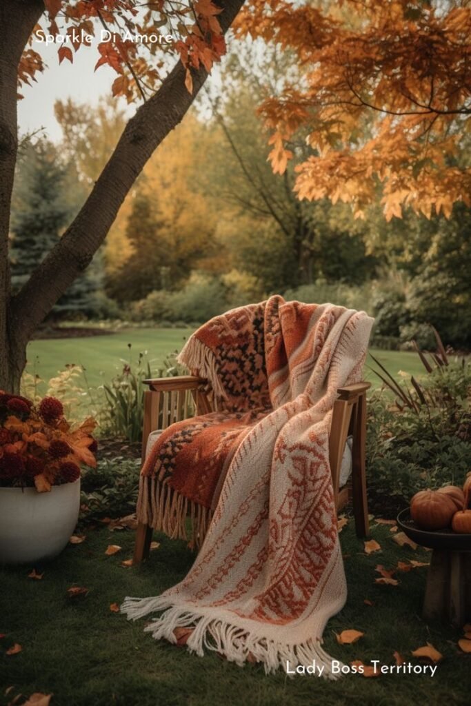 Position an antique or vintage-style chair with a folded throw. Place a mini pumpkin or fall mug on it. Nearby, add a small lantern or bouquet.