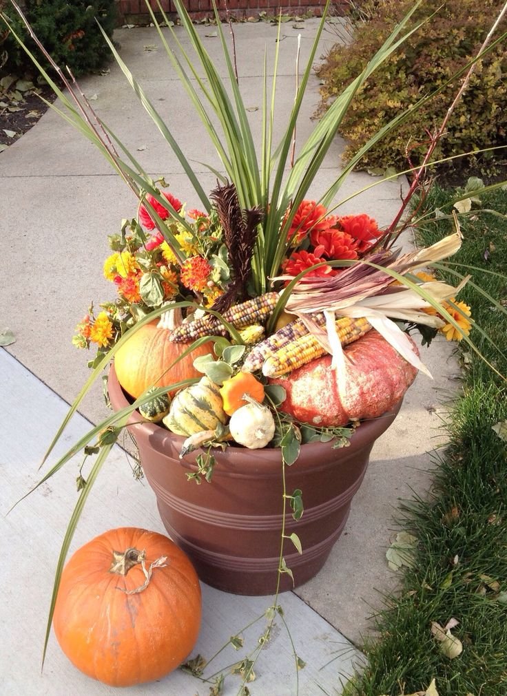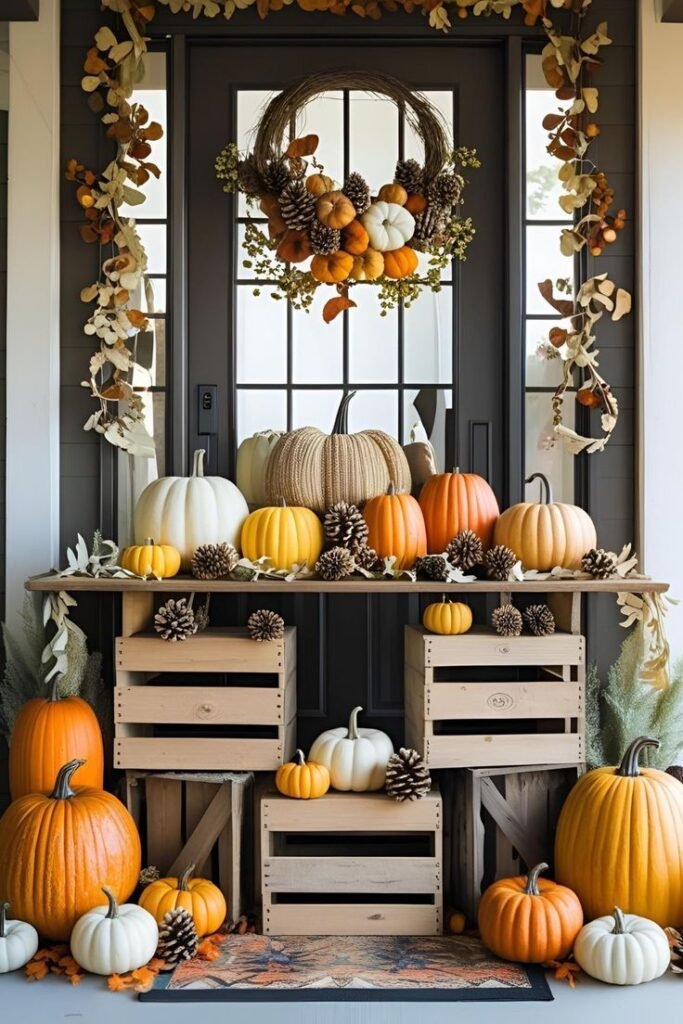 Mix real and artificial pumpkins in white, cream, green, or rust tones. Vary shapes and sizes and scatter them by the door, along steps, or on benches. Add a few gourds or hay bales for rustic charm.