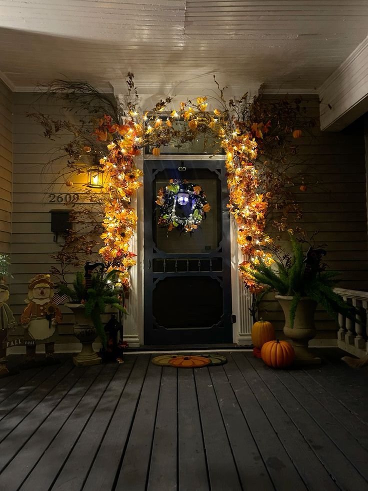 Use faux grapevine, leaves, or burlap wrapped in autumnal ribbons. Drape along railings, columns, or above the door. Add mini pumpkins or pinecones for detail.