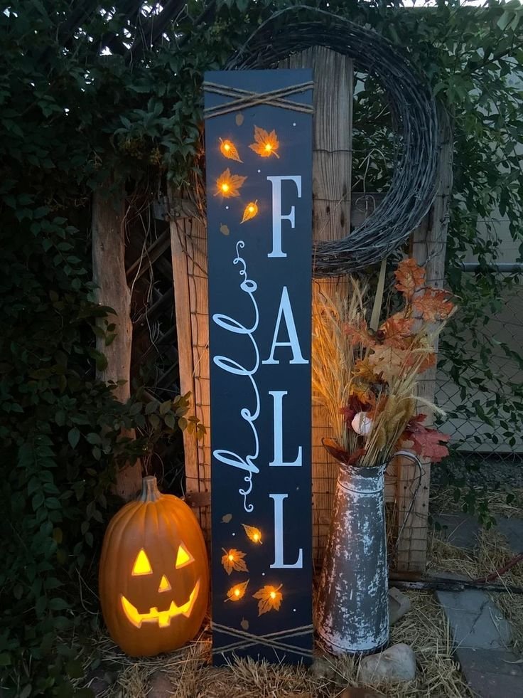 Frame a wooden sign reading “Hello Fall,” “Give Thanks,” or “Pumpkin Season.” Hang it on the door or prop it atop a crate. Use hand-painted or distressed finishes for character.