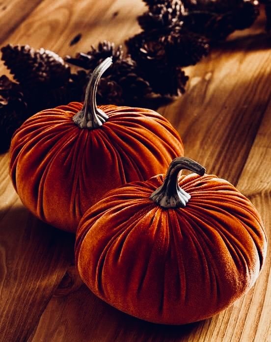 Soft velvet pumpkins in deep green, mustard, and rust colors scream cozy.