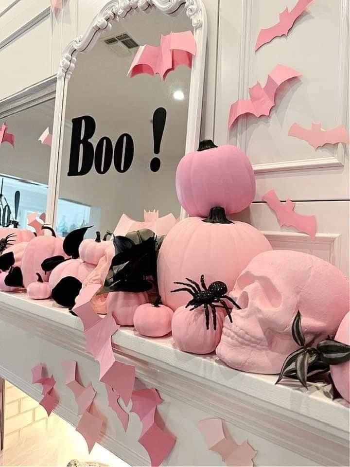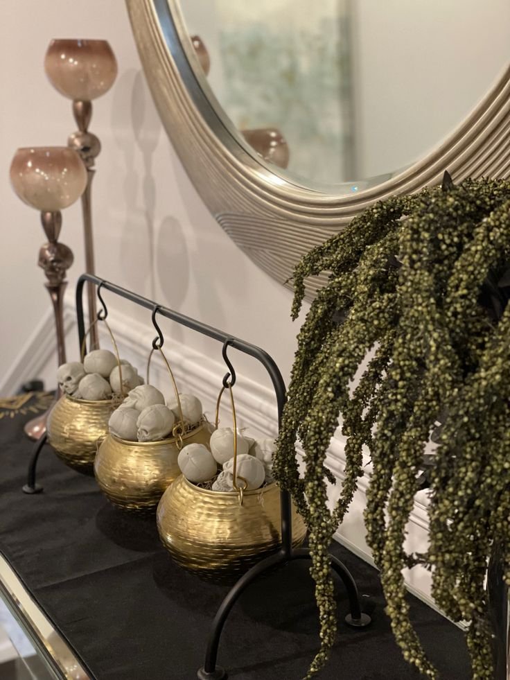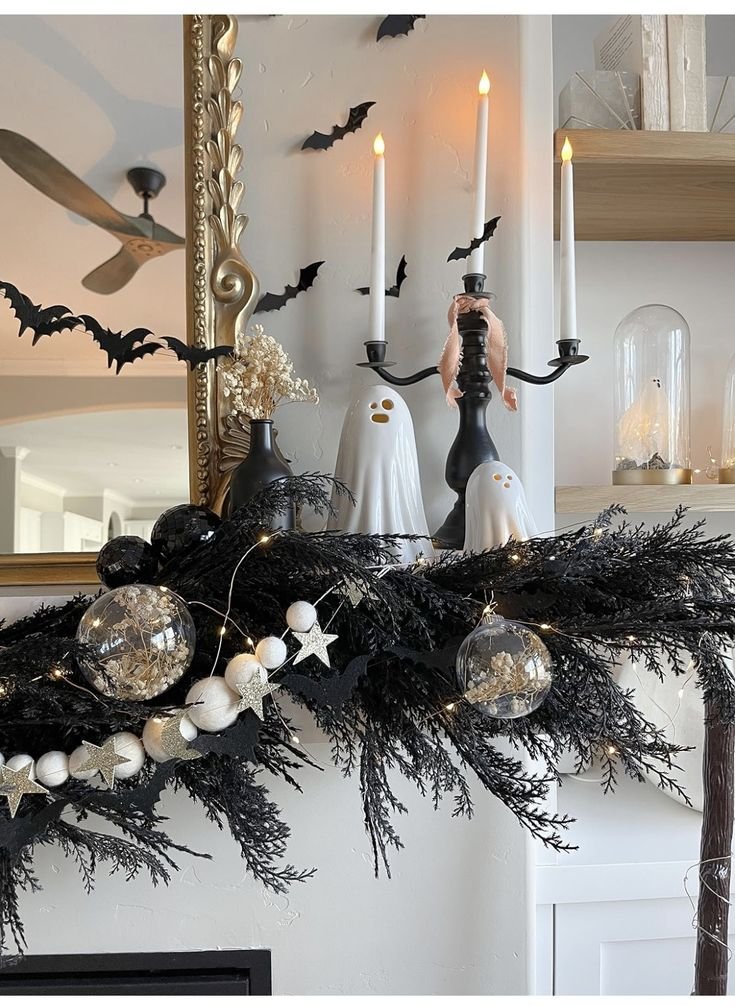 Place a gold-framed mirror behind your decor and write festive words like “October Whispers” or “Spells & Cider” with a chalk marker.