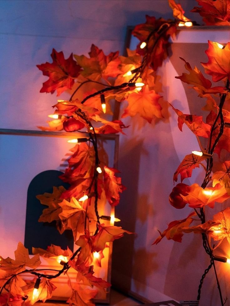 Use muted autumn leaves (sage, brown, rust) wrapped in soft fairy lights.