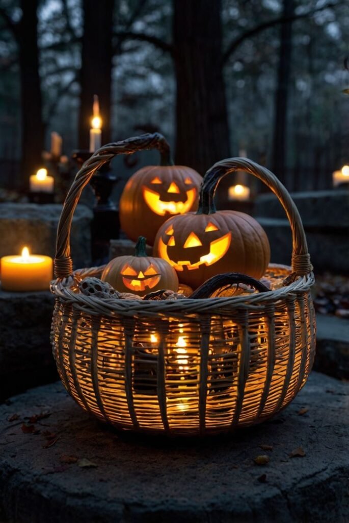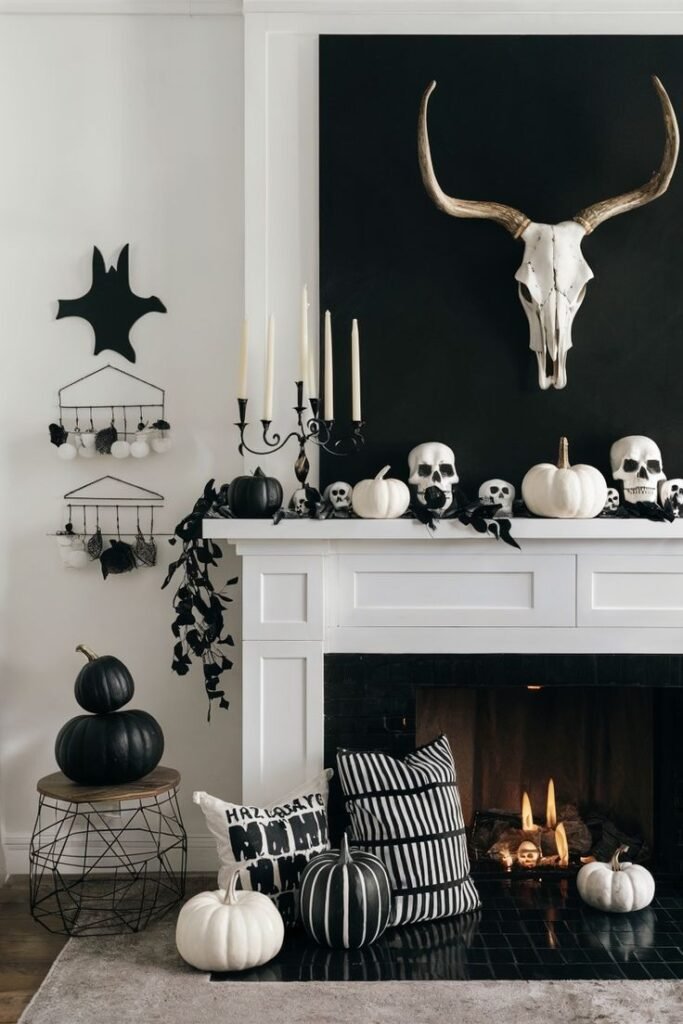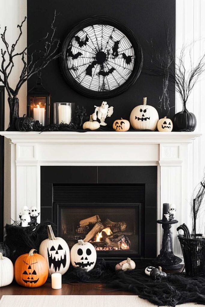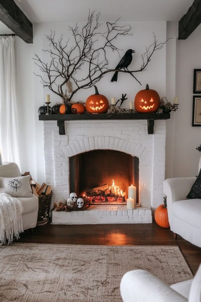 Place large woven baskets underneath your fireplace and fill them with mini pumpkins or blankets.
