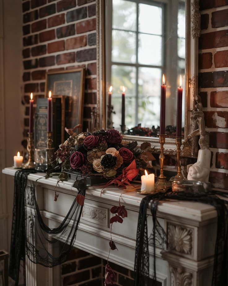 Layer dusty rose fabric and black lace across your mantle for a romantic gothic effect.