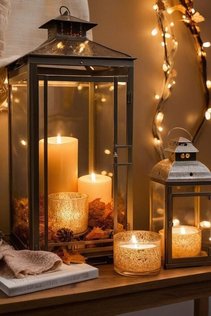 Use black, gold, or wooden lanterns and insert soft yellow LED candles inside. Line them across your mantle or place in groups of three.