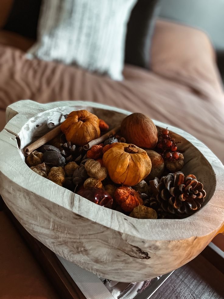 Fill shallow bowls with potpourri—cinnamon sticks, dried oranges, pinecones.
