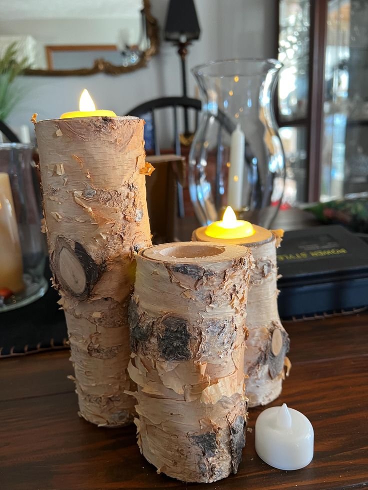 Use birchwood holders to elevate taper candles in brown, gold, or muted black.