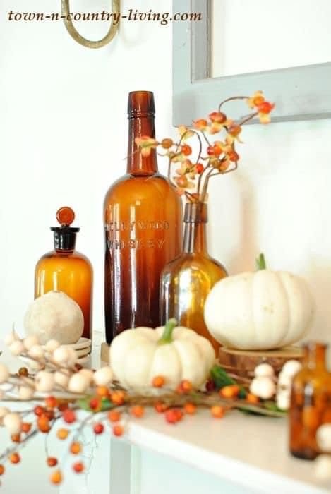 Amber-colored bottles glow warmly, especially with small string lights inside.