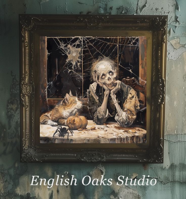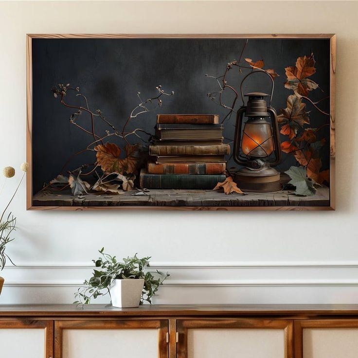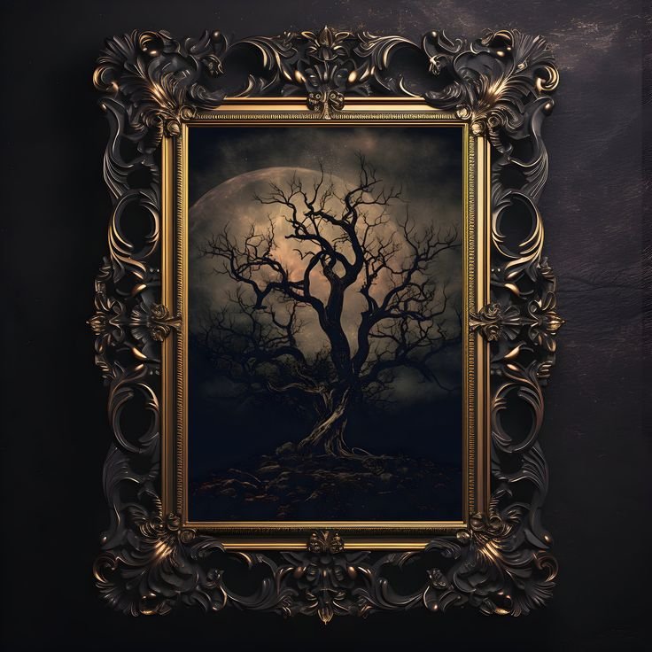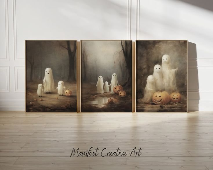 Choose art with dimly lit portraits, candlelit interiors, or eerie landscapes. Even better—add fake cracks or burn marks for effect.
