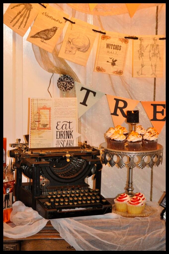 Set up a vintage typewriter with a half-typed haunted poem or an old note that says, “She never left the house…” It sparks curiosity—and chills.