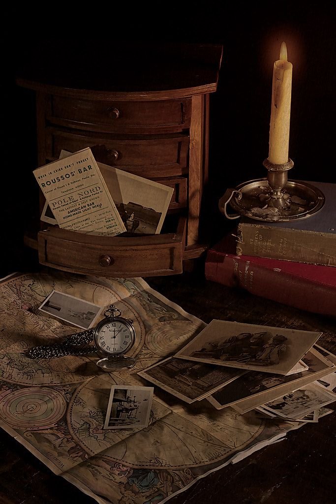 Stack a few leather-bound journals with worn pages. Open one and write a cryptic quote or unfinished letter.
