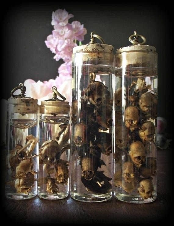 Place dried roses, baby’s breath, or lavender in tinted glass bottles. Black glass or deep amber works best for that haunted, botanical lab look.