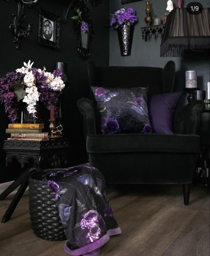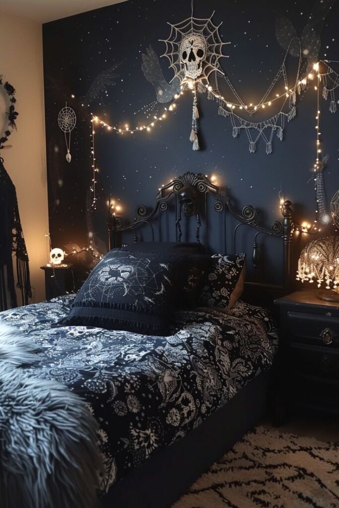Think gothic-printed trays, skull coasters, or embroidered throw blankets. These add charm without crowding your space with non-functional decor.